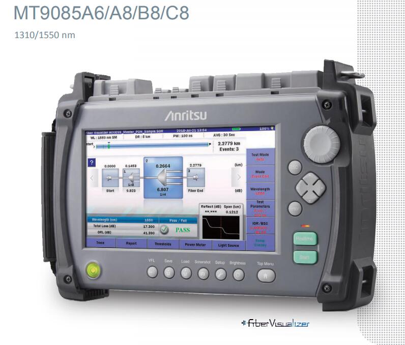 光脈沖測試可測量光纖傳輸損耗和光纖長度并檢測光纖連續(xù)性斷裂等事件。MT9085A-063光時域反射儀同時支持單模和多模光纖,且產品線包括支持與測量環(huán)境匹配的各種波長。易于使用的光纖可視器功能使用兩種類型的實時掃描(高速、高 S/N)來檢查光纖連接和彎曲的狀態(tài),同時可測試波形;MT9085C-053可檢測( 46 dB 動態(tài)范圍,0.8 m 盲區(qū))的光纖事件并測量損耗。出色的波形質量支持從短距離到長距離的光纖測量,包括 PON 和實時測量。