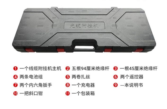 R8主機(jī)一臺(tái),電池2塊,絕緣附掛桿6節(jié),可視窗遙控器,充電器1個(gè),水口鉗1把,使用說明書1份,扎絲2卷,攜帶箱一個(gè)。